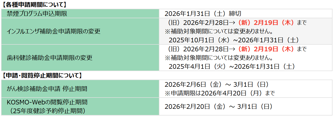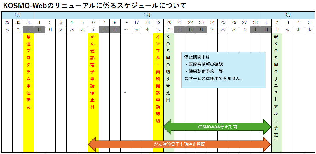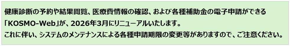 - KOSMO-Webリニューアルに伴う、インフル補助金申請等の期限変更及びサービス停止のお知らせ